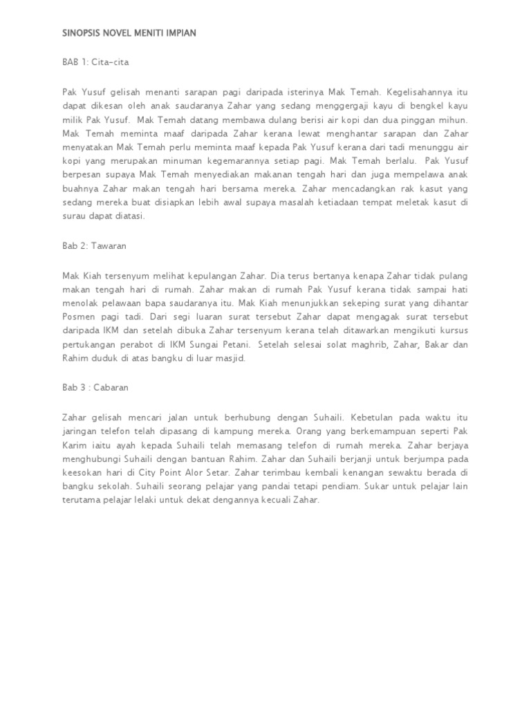 Tema Persoalan Watak dan Perwatakan Latar Masa Latar Tempat Latar Masyarakat Gaya Bahasa Nilai dan Pengajaran K2 Novel Meniti Impian. Nota Pelari Muda Sinopsis mengikut bab. Komponen sastera dan novel BM bahasa melayu.